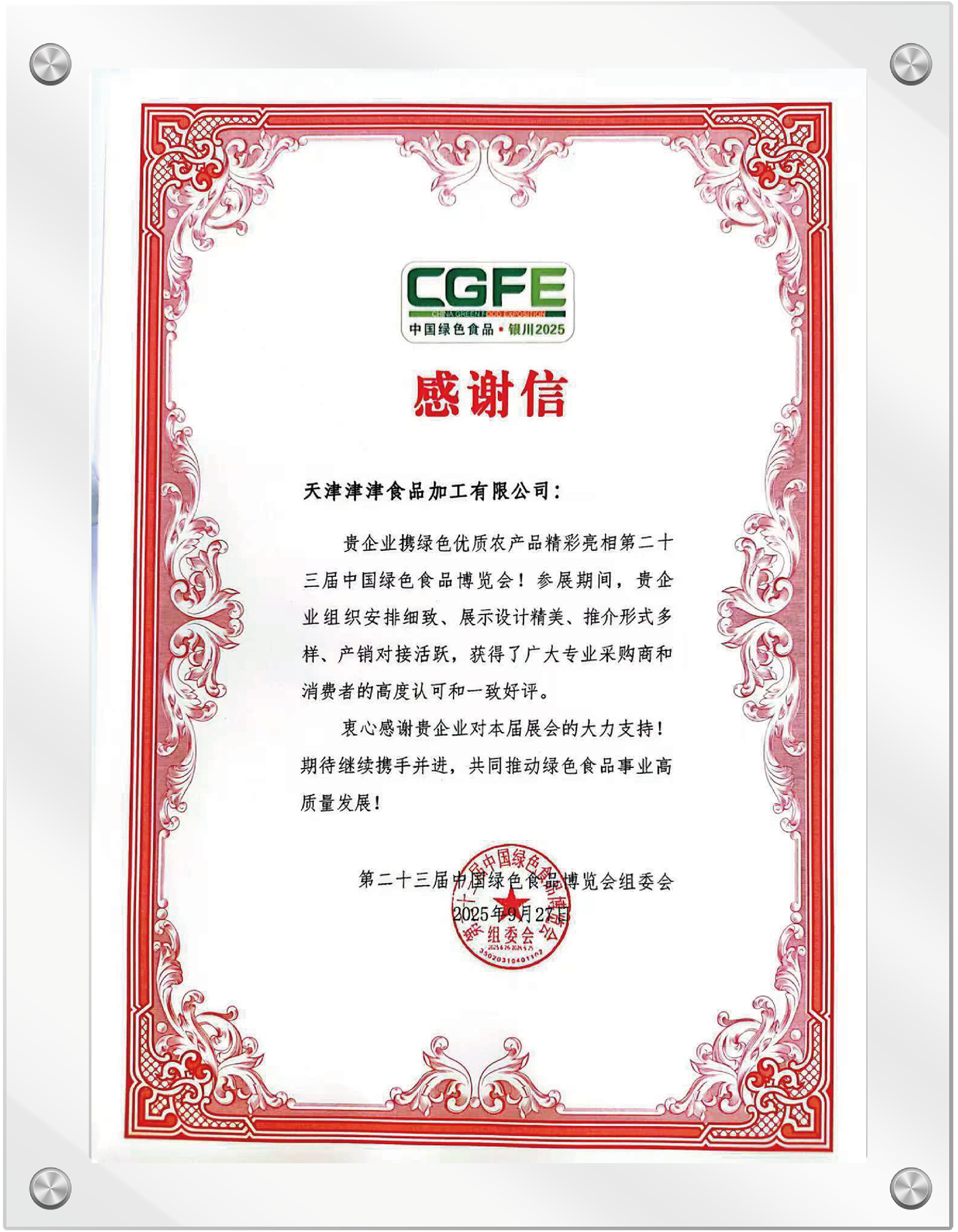 “津统”牌粉丝于1994年被国家农业部认定为“绿色食品”,2021年先后被天津市人民政府授予“农业产业化经营市重点龙头企业”,2024年荣获第二十一届中国国际农产品交易会最受欢迎产品奖,2025年上海合作组织 天津峰会指定食材供应商等荣誉。